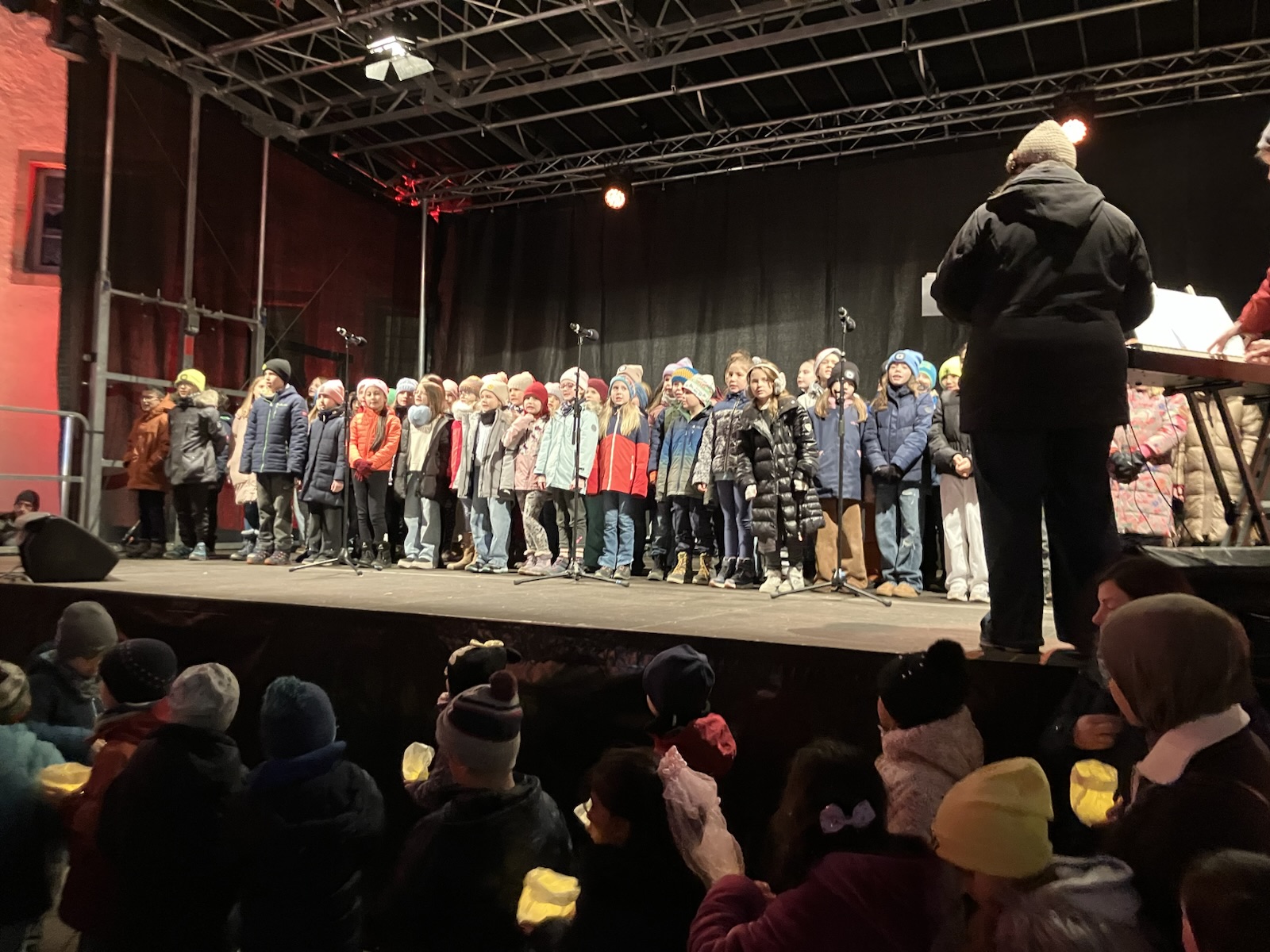 Mit dem Lied "Der Nikolaus mit seinem Sack" stimmten sich die Kinder zu Beginn des Auftritts auf den kommenden Nikolaus ein. Besinnlich ging es mit einem Quodlibet aus "We wish you a merry christmas und Licht der Weihnacht" weiter. Zum Schluss wurden die Lichter zu "This little light of mine" tanzen gelassen. Für alle Kinder war der Auftritt auf der Bühne ein spannender Moment und ermöglichte es den Eltern und Gästen daran teilzuhaben.