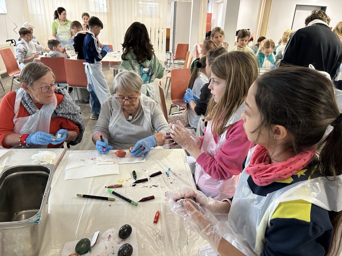 Frau Rapp erwartete uns bereits mit ihrem Team, welche die Senioren zu uns zum gemeinsamen Ostereierfärben brachte. Zwischen den älteren Senioren halfen unsere Schüler und Schülerinnen fleißig mit, die warmen Eier bunt zu bekommen. An den einen Tischen wurde mit Reis gefärbt, an den anderen in Farbe getaucht und viel verziert.